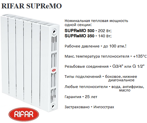 Rifar Supremo 500 с боковым типом подключения имеет травмобезопасную форму и оригинальный внешний вид, значительно отличающийся от большинства биметаллических секционных радиаторов.